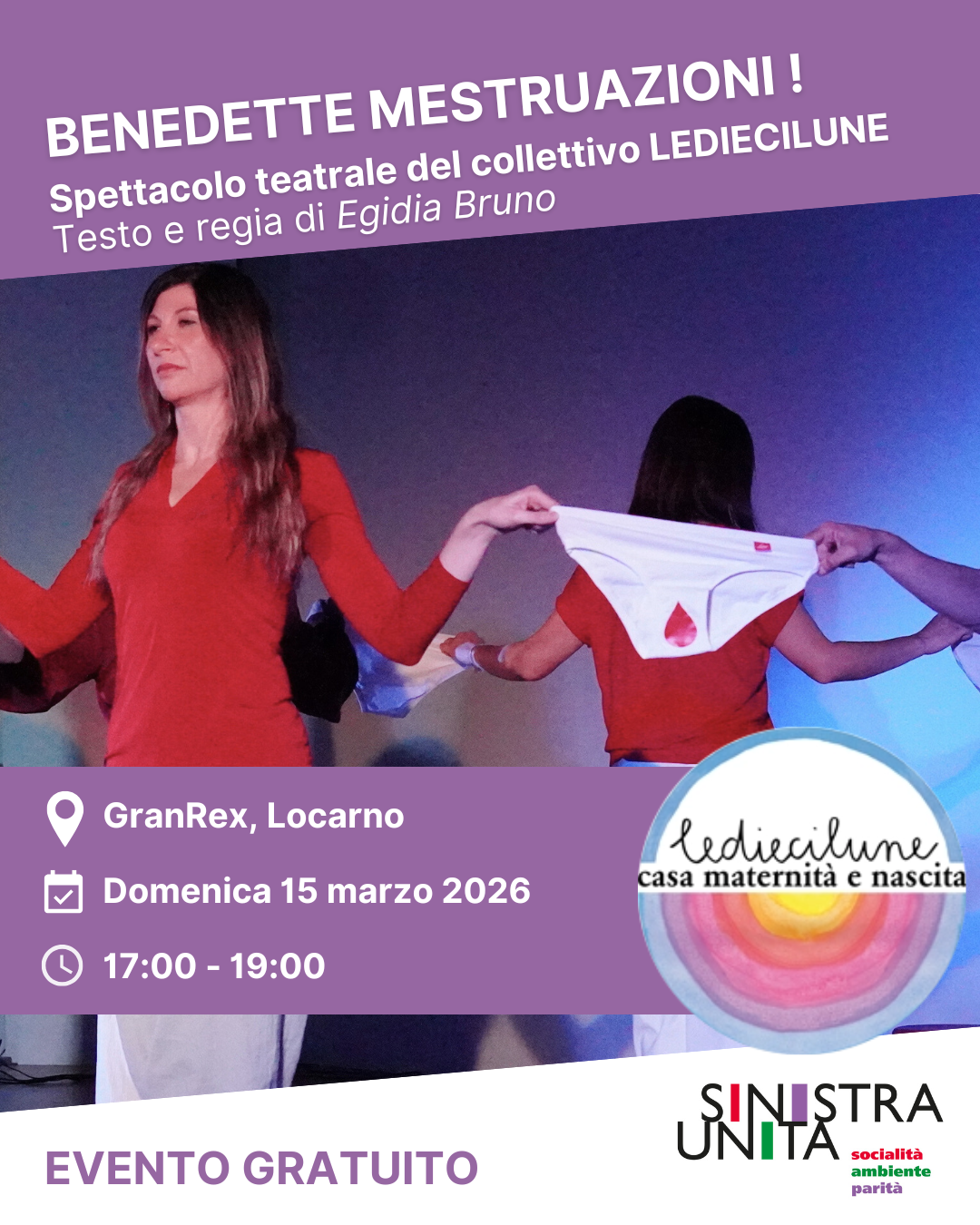 Domenica 15 marzo 2026, alle 17.00, al GranRex si terrà lo spettacolo teatrale Benedette mestruazioni ! del Collettivo lediecilune per la regia di Egidia Bruno. L’entrata è libera e lo spettacolo è adatto a tutte le persone a partire dai 10 anni.